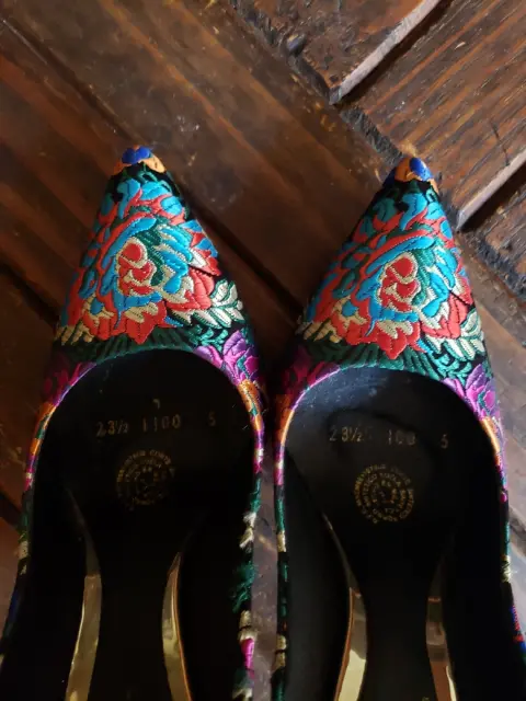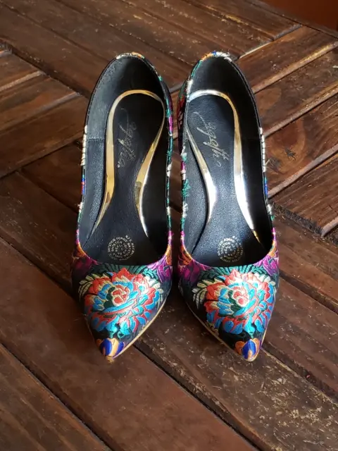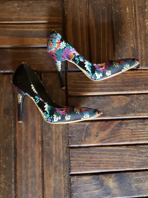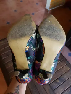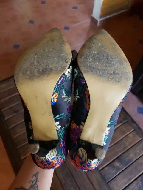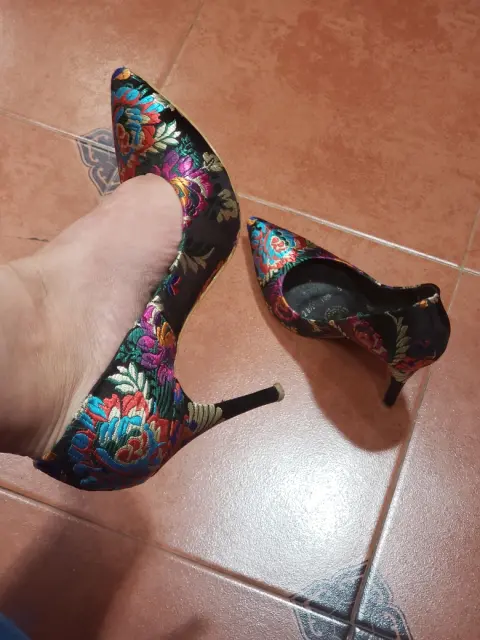 Hermosas zapatillas tipo stiletto en color de fondo negro con bordados multicolor de flores, están super hermosas*Tall 3.5*Tacón: 9cm*Detalles: Sólo los usé dos veces pero se raspó obviamente la suela, y las tapitas se gastaron, sólo eso*Calificación:9*NO OFERTAR NI BLOQUEAR LA PRENDA SI NO ESTÁS SEGURA DE LA COMPRA*GRACIAS POR TU PREFERENCIA*