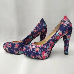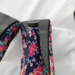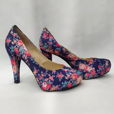 Tacones azul marino floreados. Tacón de 10cm, nuevos pero con pequeños detalles en el tacón izquierdo, creo que lo mordió mi gatita.