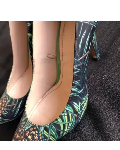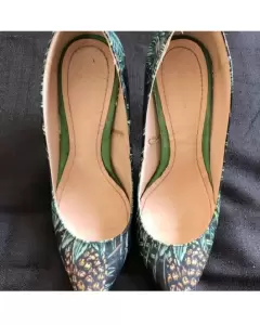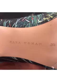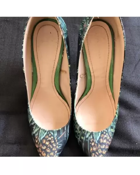 Tacones casuales multicolor. Padrísimos tacones ZARA, color verde, 25.5, con un diseño de estampado tipo tropical, como palmeras con piñas. Superfashion. El tacón es # 10. Son usados pero no mucho, sin embargo con mucho más tiempo de vida para dar, ya que su exterior está en excelente estado.