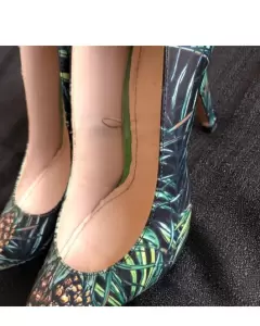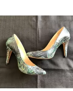 Padrísimos tacones ZARA, color verde, 25.5, con un diseño de estampado tipo tropical, como palmeras con piñas. Superfashion. El tacón es # 10. Son usados pero no mucho, sin embargo con mucho más tiempo de vida para dar, ya que su exterior está en excelente estado.