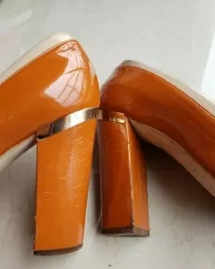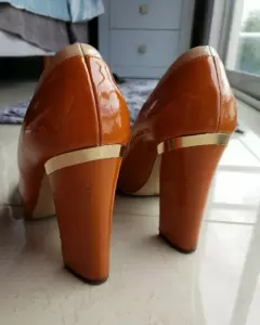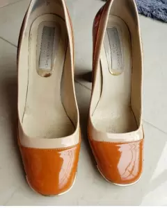 Tacones charol. Hermosos tacones color chedron con beige con detalles dorado en la punts y en el tacon, super cómodos, los rayoncitos qie tiene casi no se notan, medida tacon 11 cm, con caja y tapas de tacon adicionales