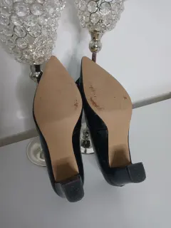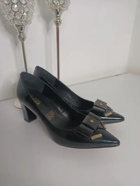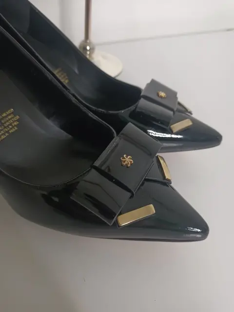 Talla 7 A estrenar sin etiqueta✨Tacones de punta super cómodos y elegantes, talla 7, color negro brillante, tacón grueso de alcance corto y acabado cuadrado, terminación en punta y moño con detalles de color dorado.
