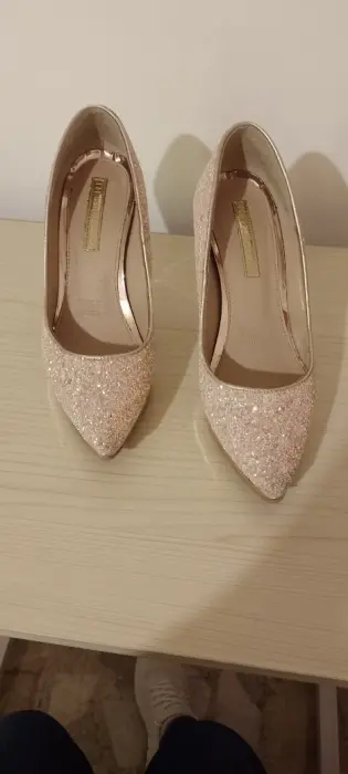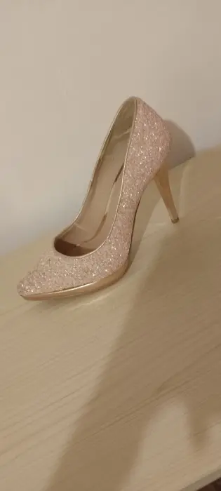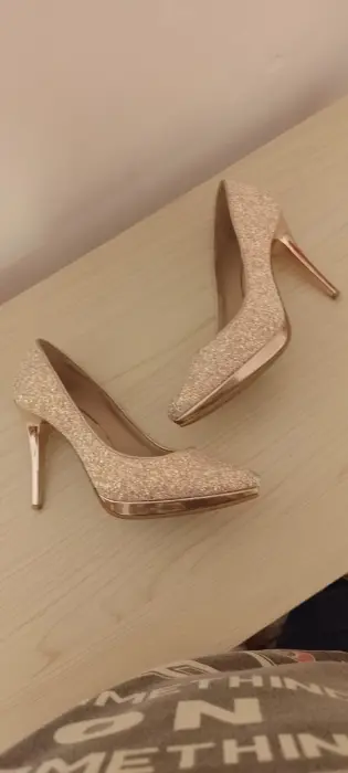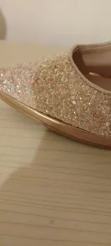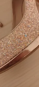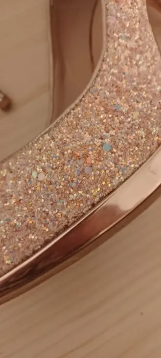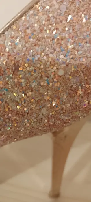 Tacones color oro rosa y dorado, son muy brillantes y el material es literalmente brillitos de colores, el tacón mide 10cm de alto