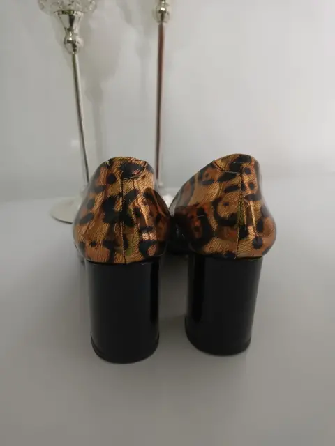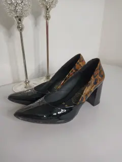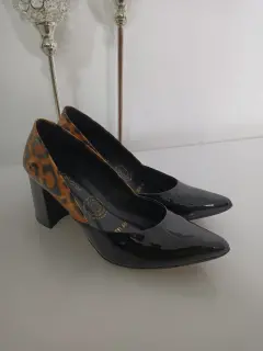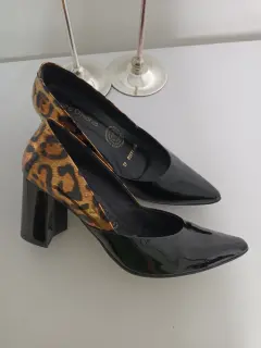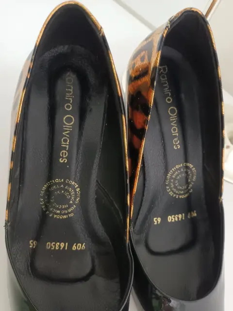 Tacones Ramiro Oliv. animal p. talla 6.5. ✨Tacones elegantes y cómodos con diseño animal print, estilo charol, talla 6.5, diseñador Ramiro Olivares, tacón grueso cuadrado de alcance corto, color negro brillante con estampado color dorado.