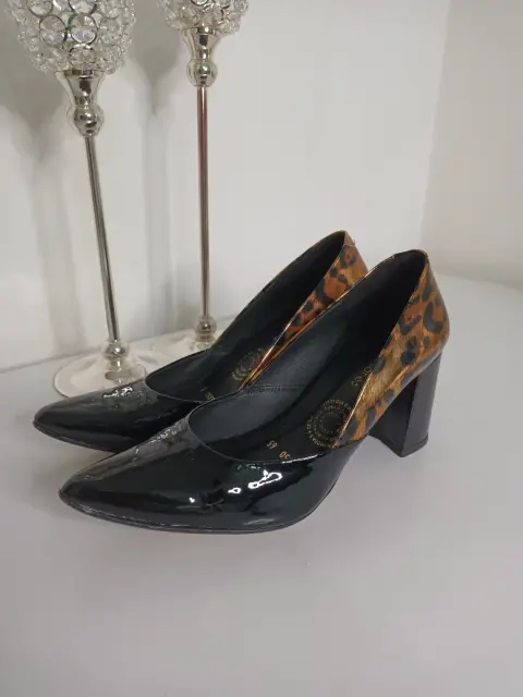 ✨Tacones elegantes y cómodos con diseño animal print, estilo charol, talla 6.5, diseñador Ramiro Olivares, tacón grueso cuadrado de alcance corto, color negro brillante con estampado color dorado.