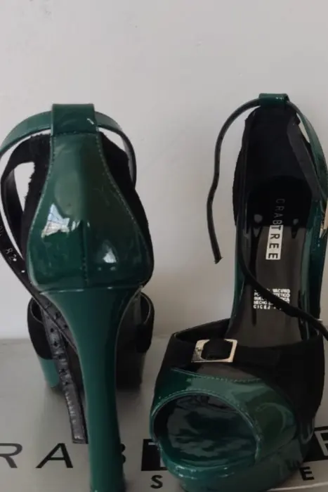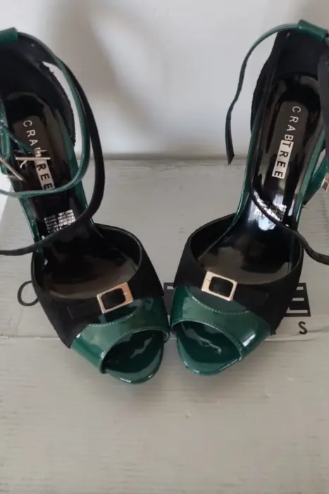 Zapatillas Crabtree número 25.5 color: azul turquesa/ negro Material: Charol/ante, plataforma 2 cms, tacón 12 cms.