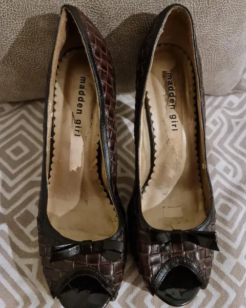 ZAPATILLA CAFE TEJIDO DE PIEL!!STEVE MADDEN!. HERMOSA ZAPATILLA DE PIEL!! CAFE TEJIDO!! CON CHAROL! TALLA: 4.5/ ALTO: 9.5cm/MADDEN GIRL!!TODO EL MATERIAL DE PIEL Y CHAROL DE LA ZAPATILLA ESTA ENTERO SIN DETALLE!! SOLO LA PARTE INTERNA POR DESPEGADO DE ETIQUETA, Y DETALLES POR USO INTERNO,NADA QUE AFECTE A SU USO,LA SUELA CON DESGASTE PERO UTILIZABLE!!!