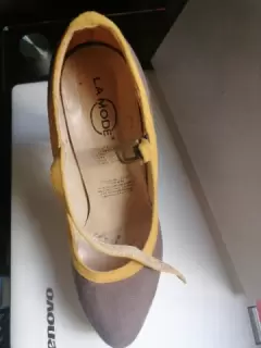 Zapatilla café vivos amarillos. Zapatilla aterciopelada color café tacon 12 cm, y plataforma de 2 cm.Corte textil, forro y Suela sintética