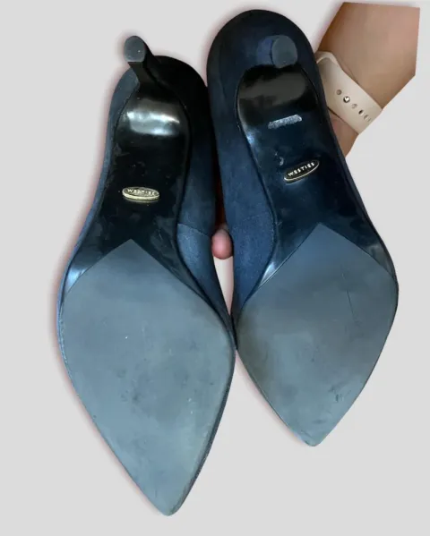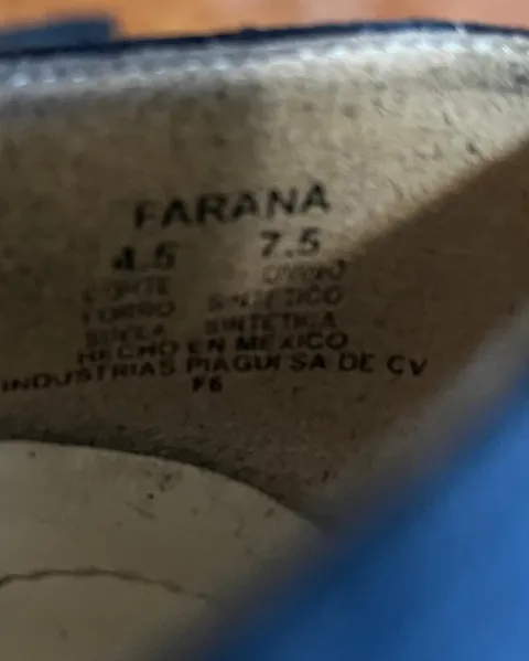 Zapatilla cerrada de tacón, color azul de gamuza.Talla 4.5 mx, tacón 8 cmEn excelentes condiciones, sin detalles