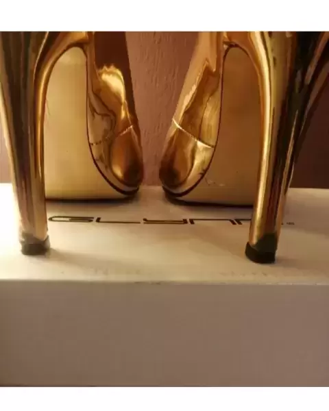 Marca : GlynnTextura : Dorado terminado espejoTacón : 10 cmsTalla : 24 cms.Detalle : Área del tacón inferior , junto a la tapa está desvanecido el color, fotografía 3 y en áreas interna de los costados ligeramente tallado, está en fotografía núm 4 Marca : GlynnTextura : Dorado terminado espejoTacón : 10 cms.Talla : 24 cms.Detalle : Área del tacón inferior , junto a la tapa está desvanecido el color, en la fotografía 3, y en el área interna de los costados ligeramente tallado, En fotografía núm 5.es por el rose de las zapatillas al caminar