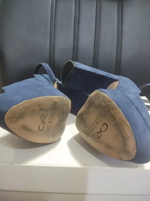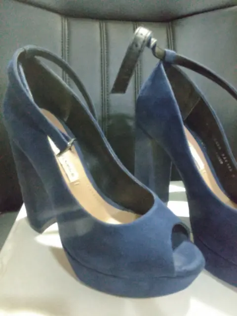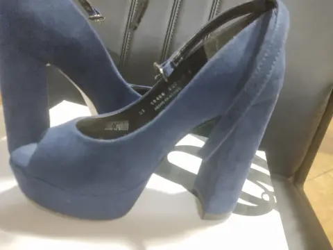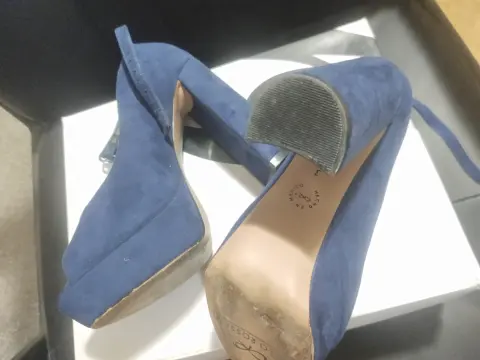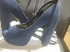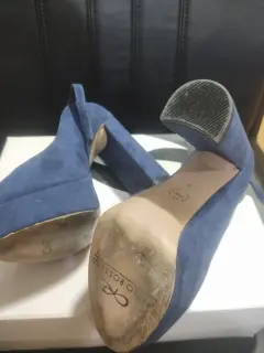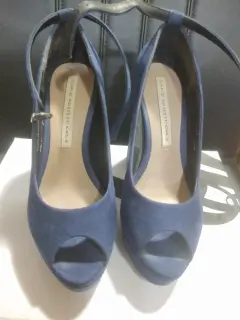 Zapatilla con correa y descubierta en la parte de adelante, están hermosas material tipo gamusa en azul marino, en perfectas condiciones.