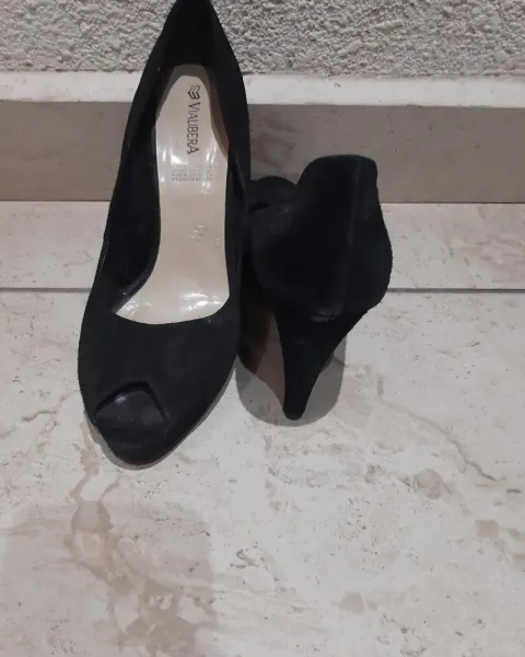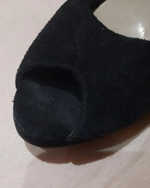 Zapatilla de Gamuza. Zapatillas de tipo gamuza con abertura en la parte de enfrente, corte vacuno con suela sintetica antiderrapante, tacon numero 10, con pequeño raspon en la gamuza de la parte del tacon.
