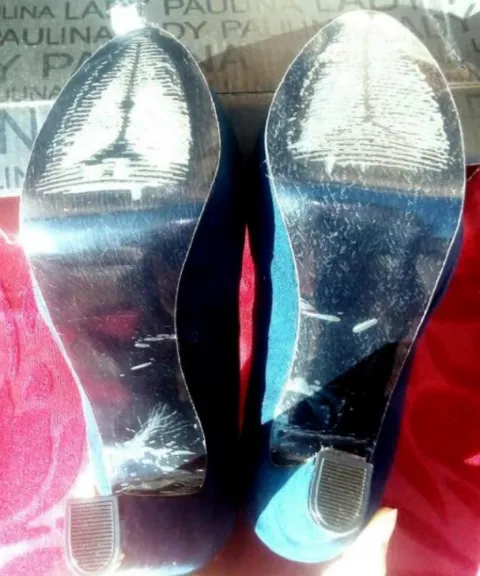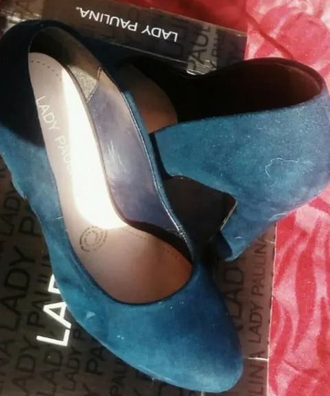 Son zapatillas de plataforma Num 4. Corte de textil (gamuza) color azul, forro y suela sintético. Tacón mide 13 cm, la plataforma 3 cm. No se han usado. Están listas para estrenar. La suela tiene una cubierta plástica. Tiene como detalle una mancha blanquisca que se observa en 2 fotos. Es la misma mancha.