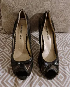 ZAPATILLA DE TELA CAFE ROMBOS!!MADDEN GIRL!!. LINDA ZAPATILLA CAFE DE TELA EN ROMBOS!! COMBINABLE!! MADDEN GIRL!! TALLA: 4.5/ FORRO INTERNO COMPLETO NO DETALLE/ TELA Y CHAROL DE ZAPATILLA ENTERA SIN DETALLES/ UNICO DETALLE EN PUNTA IZQUIERDA LIGERO ACHATAMIENTO PERO NO LE AFECTARA A SU USO!!SUELA ENTERA !!! ALTO: 9.5cm