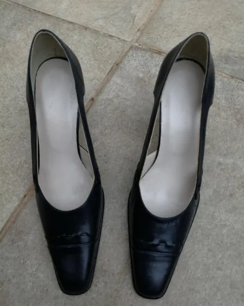 Zapatilla de piel, color azul marino, suela de vaqueta, talla 4, tacon no. 7, nuevos. Muy cómodos.