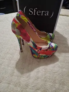 Zapatilla floreda para Dama. Hermosa Zapatilla floreada para Dama, marca Andrea, tacón 15, con plataforma delantera, número 5, en buenas condiciones