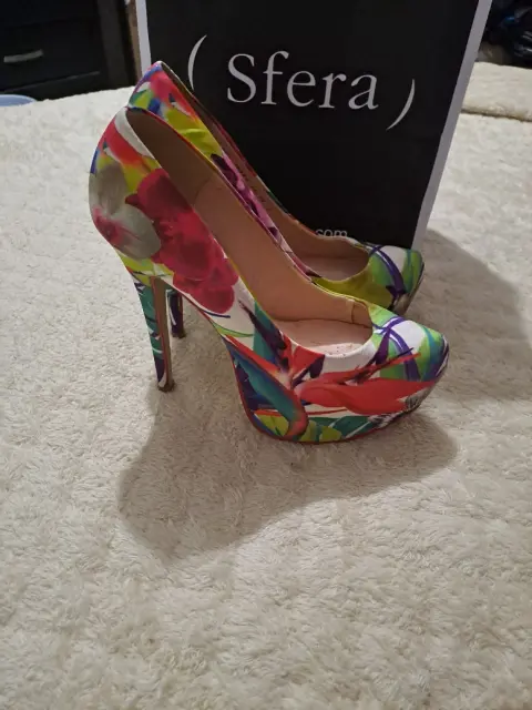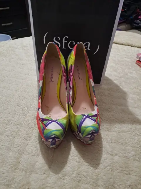 Hermosa Zapatilla floreada para Dama, marca Andrea, tacón 15, con plataforma delantera, número 5, en buenas condiciones