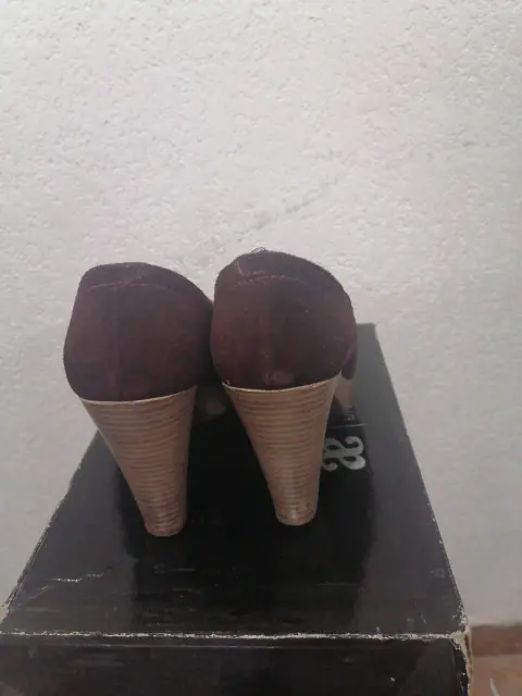 Zapatilla Andrea color café de gamuza, plataforma, talla 24, tacón 9, de uso en muy buen estado, caja de fábrica. Precio $200.00