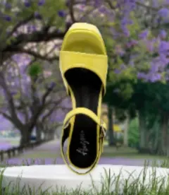 Zapatilla retro, color limón, acabado en charol, tacon ancho altura 13 cm, disponible en talla 3 y 4, la forma del tacon y la plataforma ayuda a que puedas caminar, sin problema alguno, adicional es un calzado muy ligero están padrisimos!!!😍 Marca Abusiva