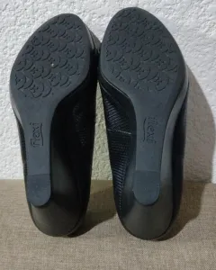 Zapatilla tacon de puente, marca Flexi, número 6 1/2, corte vacuno, forro sintético, suela sintética, plantilla cerdo, alto de tacon 9 cm, tiene pequeños detalles poco visibles en el tacon del pie izquierdo.