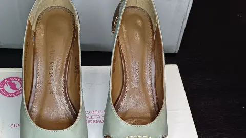 Zapatilla tipo boca pescado. Zapatilla estilo boca de pescado, bitono, material piel y forro sintético, 11cm de alto de tacón