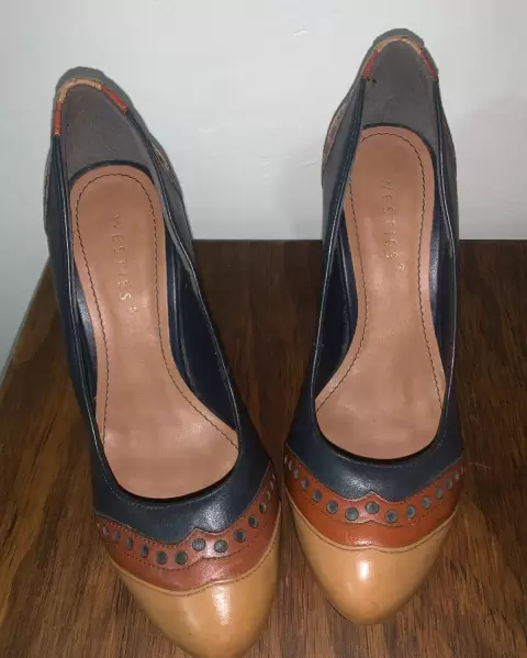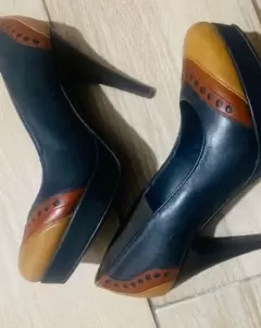 Zapatilla tricolor Westies. Hermosas, combinables y elegantes zapatillas, con ligera plataforma que hacen que el tacón no se sienta tan alto, son color base Azul marino con vivos en camel y miel. Las puedes combinar con todo hasta con jeans y lucirás un outfit elegante y moderno