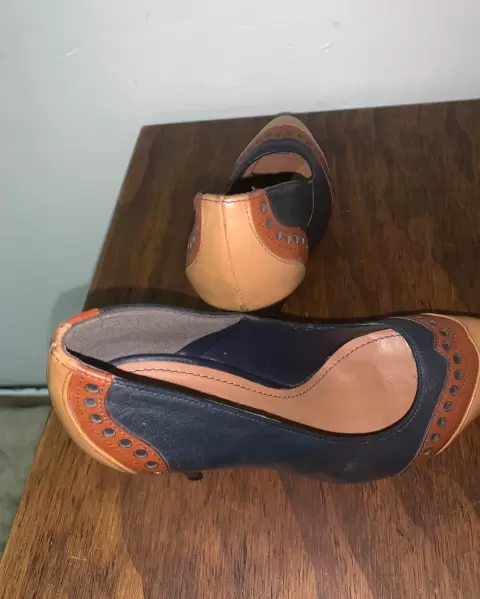 Hermosas, combinables y elegantes zapatillas, con ligera plataforma que hacen que el tacón no se sienta tan alto, son color base Azul marino con vivos en camel y miel. Las puedes combinar con todo hasta con jeans y lucirás un outfit elegante y moderno
