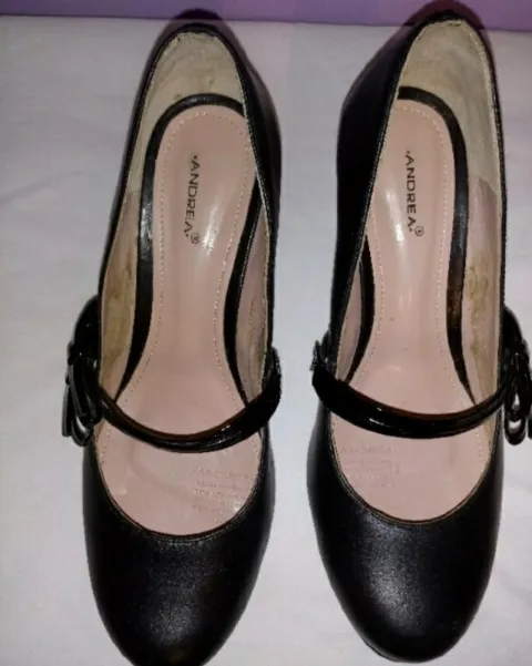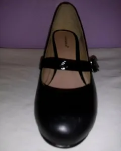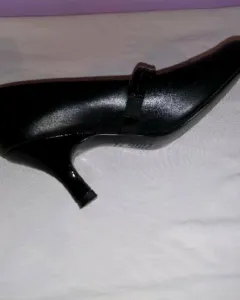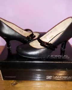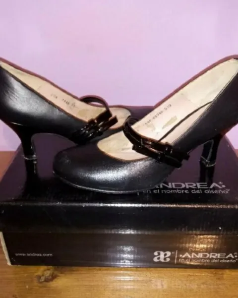 Bonitas y comodas zapaillas negras, talla 23.5, con doble correa con moño y elastico, tacon aprox. 5 cms., fueron usadas 2 ocaciones, tienen detalle por dentro: el material esta descarapelado en los costados ( se puede observar en las fotos)
