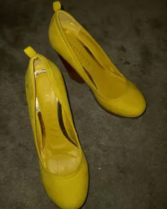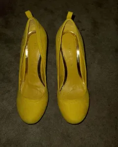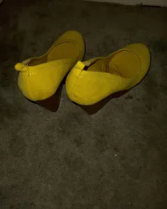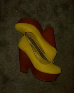 Zapatillas de color amarillo,con una plataforma café,con hermoso acabado.