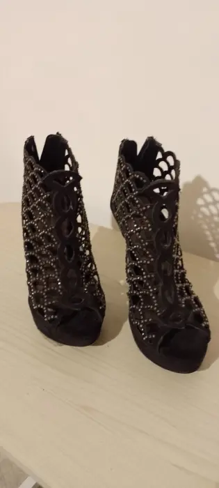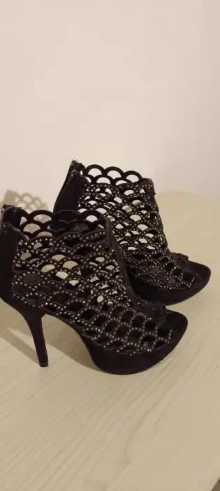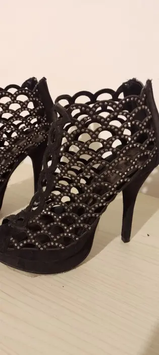 Zapatillas abiertas color negro con detalles de brillos, el tacón es de 12cm de alto.