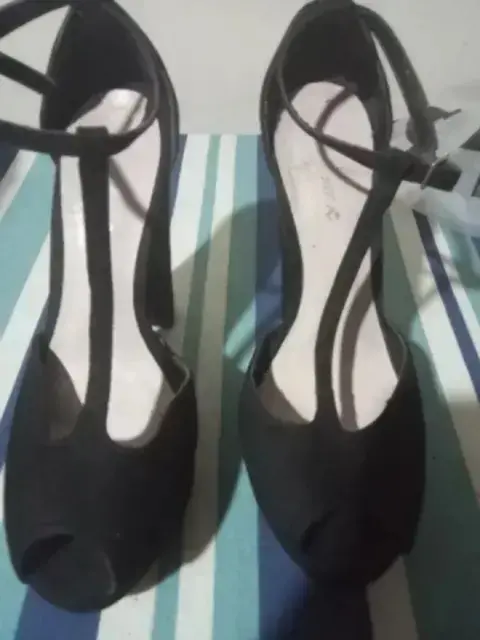 Zapatillas Andrea de ante negro, se usaron pocas veces, la suela tiene marcas porque se usaron en boda de jardín, estuvieron guardadas casi dos años ya que tuve un accidente de cadera y ya no los puedo usar, al limpiarlas la correa por dentro se despinto poco y la plantilla tiene detalles al limpiarlas.
