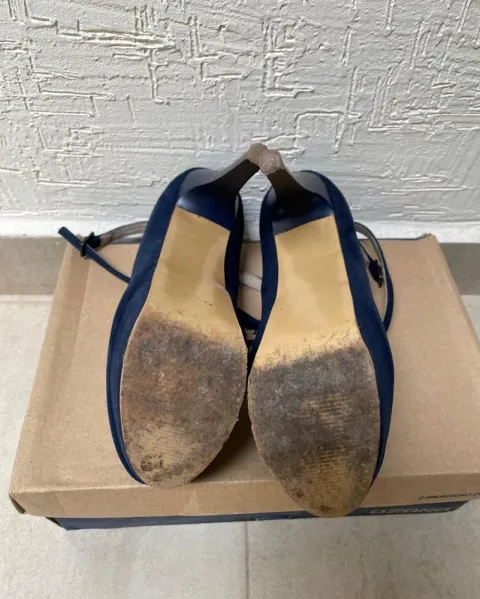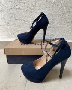 Zapatillas de tacón en color azul marino, son de ante, traen correas para abrochar al tobillo, estan en muy buen estado, pocas puestas, tacón 13cm y plataforma 3cm