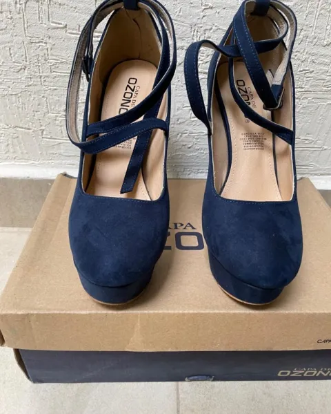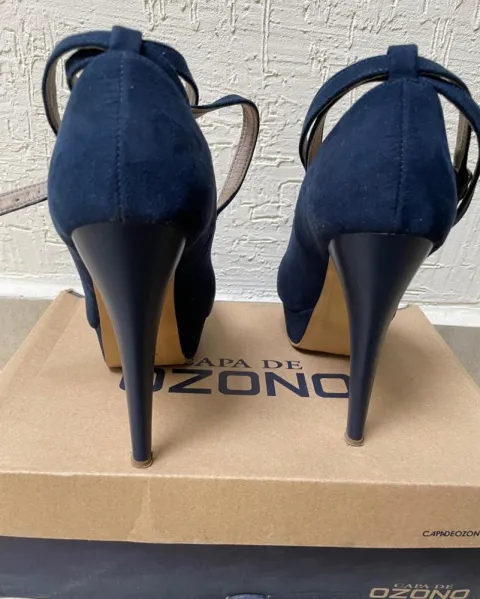Zapatillas Capa de Ozono. Zapatillas de tacón en color azul marino, son de ante, traen correas para abrochar al tobillo, estan en muy buen estado, pocas puestas, tacón 13cm y plataforma 3cm