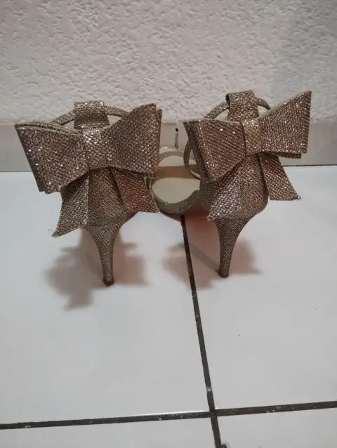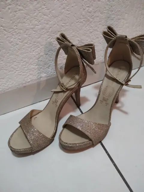Bonitas zapatillas doradas, el moño se le cayó y se le pegó con silicón, solo puestas una vez, no tiene detalles, tacon 9cm
