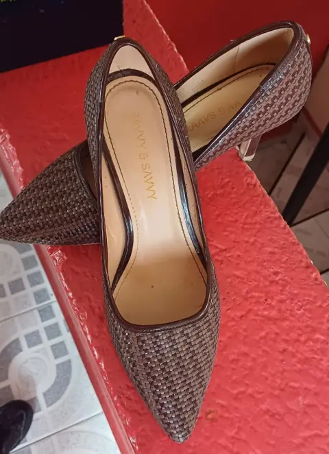 Zapatillas Color Café de la marca savvy & savvy. Bonitas zapatillas color café en forma de cuadritos en perfectas condiciones el tacón en buen estado tacón bajito son del 4.5 dan a un 5.