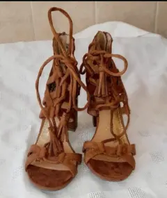 Hermosas y cómodas zapatillas color marrón #2 1/2, tacon#9, el material es de gamuza, y la suela de goma,traen un bonito diseño de agujetas, son usadas, traen un pequeño detalle en el tacon es una pequeña mancha, casi no se ve, se muestra en la imagen. Lo demás viene en perfectas condiciones.