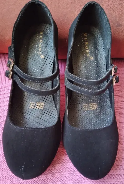 Zapatillas con correa. Zapatilla negra, con doble correa ajustable, tacón de 8 cms aproximadamente, gamuza, talla 3