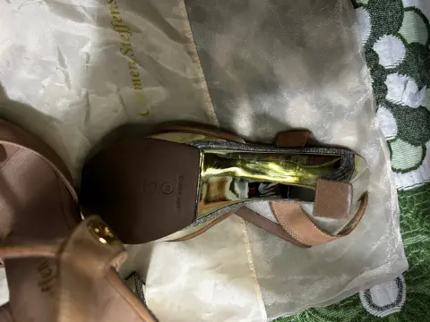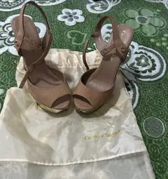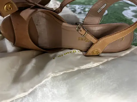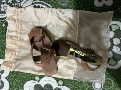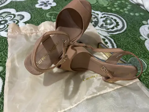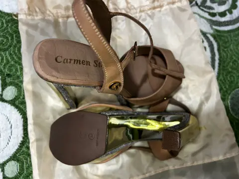 Zapatillas de marca brasileña (Carmen Steffens) gamuza, talla 3, alto 12 cm, muy cómodos, pedrería en lo alto del tacón