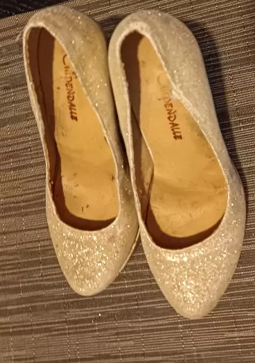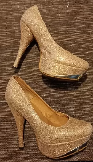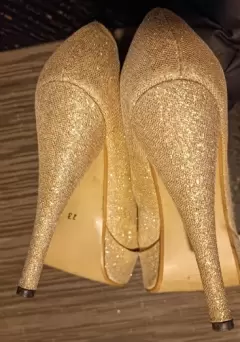 ZAPATILLAS CON PLATAFORMA #23. ZAPATILLAS CON PLATAFORMA DE 3 CM, DE USO #23,COLOR DORADAS CON GLITTER,DETALLE MINIMO PIE IZQUIERDO,EN ÚLTIMA FOTO,TACON 12 CM ESTA PRENDA ENTRA EN 2 PIEZAS POR $150,MARCA CINDERELLE