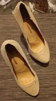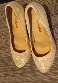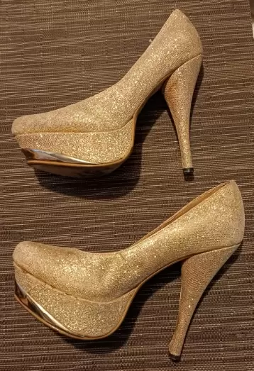 ZAPATILLAS CON PLATAFORMA DE 3 CM, DE USO #23,COLOR DORADAS CON GLITTER,DETALLE MINIMO PIE IZQUIERDO,EN ÚLTIMA FOTO,TACON 12 CM ESTA PRENDA ENTRA EN 2 PIEZAS POR $150,MARCA CINDERELLE