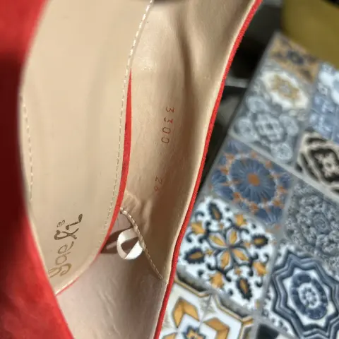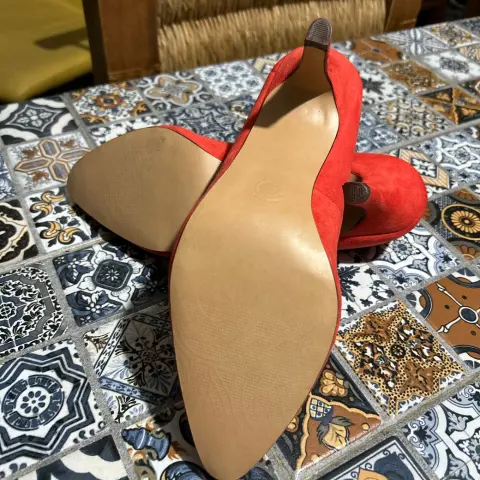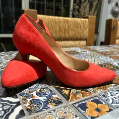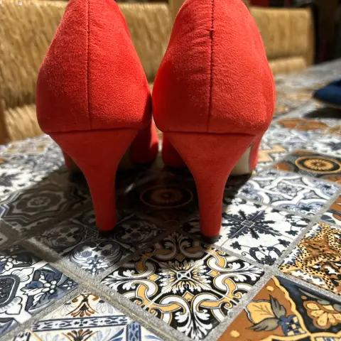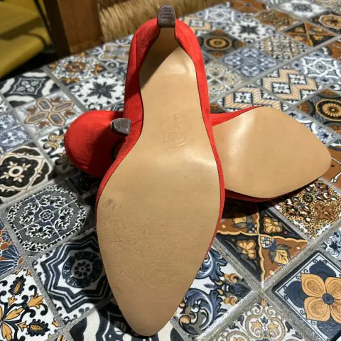 Zapatillas coral gamuza. Increíbles estas zapatillas tacón 7 pero súper cómodas! El color está increíble y combina con casi todo! Solo tienen uso de un día y después mi espalda dijo “nunca mas” pero es porque estoy mal hecha yo, no las zapatillas 😌 tienen un detallito en la suela pero es porque camine por un mal camino 😞