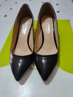 Hermosas Zapatillas de charol color negro, tacón del 5, con detalle en la parte del Talon por ambos lados en forma de onda, con uso de una sola vez