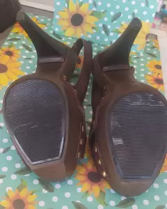 Zapatillas de plataforma y tacón, corté vacuno, forro sintético y suela sintética. Solo se usaron una vez, no cuento con la caja pues ya tienen tiempo. La plantilla interna está un poco maltratada por la puesta y el tiempo de estar guardados. Se envía en caja reciclada.