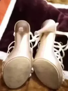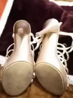 Son color arena, con Tiras cruzadas, tienen piedritas de decoración, se abrocha por atras, tacon muy comido