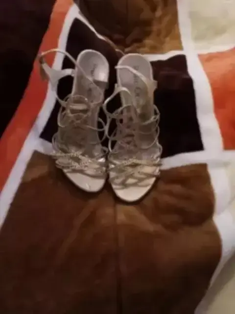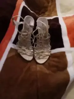Zapatillas de tacon. Son color arena, con Tiras cruzadas, tienen piedritas de decoración, se abrocha por atras, tacon muy comido