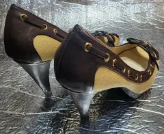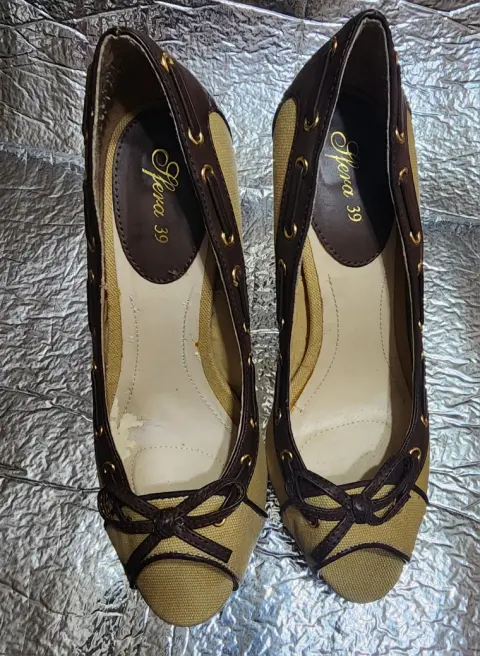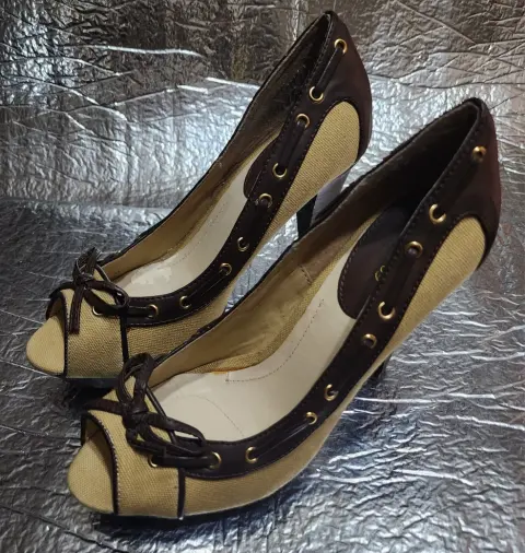 Color beige con acabados caféPunta abiertaMarca SFERATalla 25.5 Altura tacon 12 cmSeminuevas, excelentes condiciones.