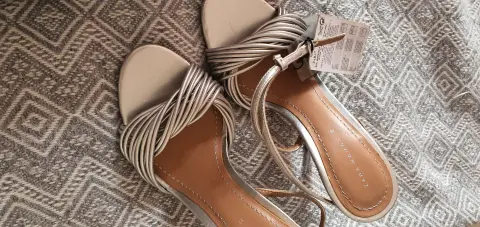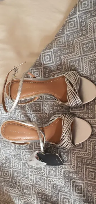 Zapatillas de tiras plateadas de Zara. Zapatillas de tacon alto color plateadas. Tienen muchas tiras al frente. Están muy bonitas, son nuevas y con etiqueta pero si tienen algunos detalles, sobretodo en el tacón, son casi imperceptibles pero prefiero que los vean(ultima foto). Traen tapas de repuesto