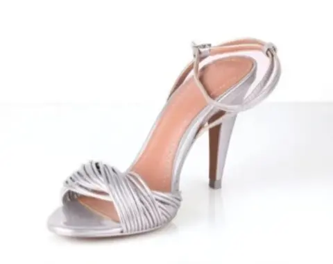 Zapatillas de tacon alto color plateadas. Tienen muchas tiras al frente. Están muy bonitas, son nuevas y con etiqueta pero si tienen algunos detalles, sobretodo en el tacón, son casi imperceptibles pero prefiero que los vean(ultima foto). Traen tapas de repuesto