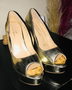 Hermosas zapatillas doradas tipo charol, talla 24, altura: 13 cm. Tiene pequeños detalles de uso como rayones que no afectan su estética. Muy lindas para una fiesta. 🎉