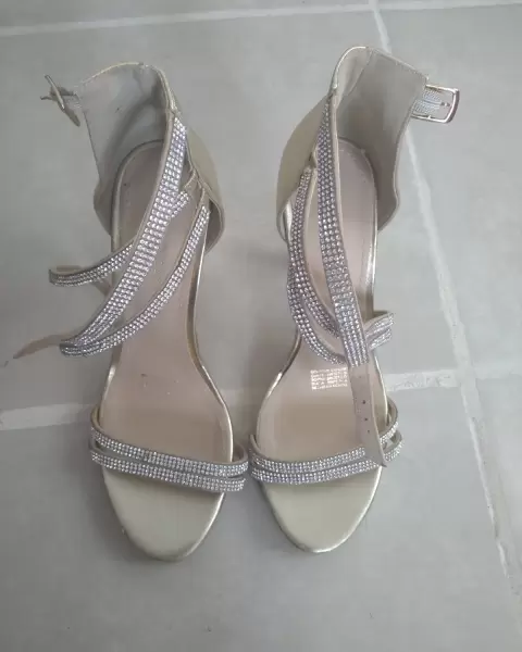 Zapatillas Dorothy Gaynor en color dorado, con detalles de brillos en correas, del numero 6. Tacón 10 cm, sin detalles